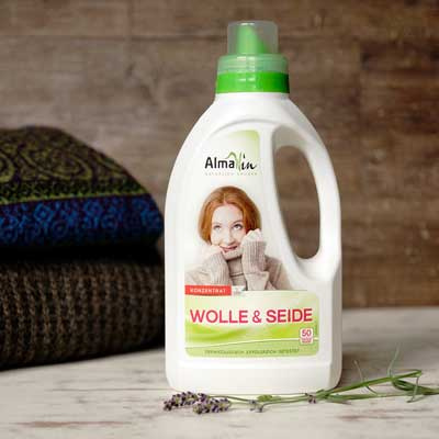 Das AlmaWin Wolle&Seide -Waschmittel wäscht mit Tensiden auf pflanzlicher Basis und verfügt zusätzlich noch über pflanzliche Glyceride und Weizenprotein, die die Fasern pflegen. Bitte nicht überdosieren. Das schont Wäsche und Geldbeutel. Übrigens: Auch als waschbar ausgewiesene Daunenjacken, - decken oder Schaffelle können bedenkenklos mit AlmaWin Wolle & Seide gewaschen werden.
