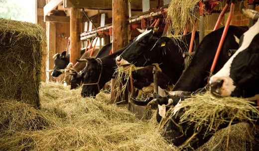 Wir kümmern uns täglich um eine Herde von 28 behornten Milchkühen. Vom Frühling bis zum Herbst weiden unsere Kühe auf den kräuterreichen Wiesen rund um den Hof. In den Wintermonaten bietet die große Liegehalle ihnen viel Platz, um sich im Stroh auszuruhen. Die Fütterung mit Gras, Heu und Getreideflocken ist die Basis für eine ausgezeichnete Qualität der Milch und damit für die hochwertigen Produkte aus unserer Käserei.